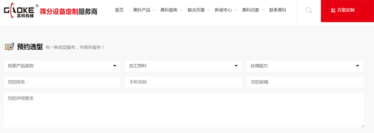 利用互聯(lián)網(wǎng)平臺,高科機(jī)械還推出在線預(yù)約選型服務(wù),您只需要打開高科機(jī)械官網(wǎng),在高科服務(wù)一欄中找到預(yù)約選型服務(wù),即可在線填寫設(shè)備使用的產(chǎn)品類別、加工物料種類及處理能力等信息,留下聯(lián)系方式后,我們的工作人員會在兩個工作日內(nèi)回復(fù),為您提供科學(xué)合理的選型方案。